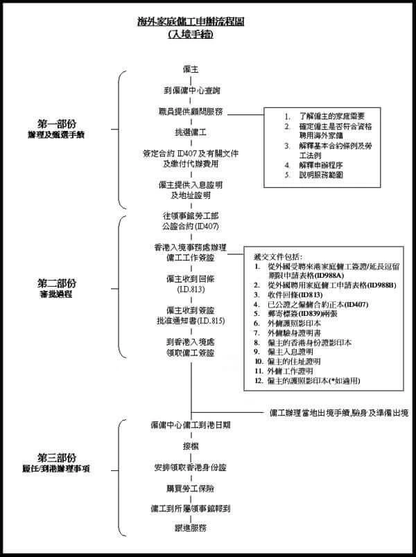 註: 外籍家庭傭工的簽證申請,是由香港入境事務處簽證管制科負責辦理。現時的 標準僱傭合約 (ID 407)是由香港 入境事務處 與 勞工處 於1975年共同草擬,並由當時的駐馬尼拉英國領事館及菲律賓政府所確認。而最新的修定本為2016年11月修正本。其他私人合約是絕對不受香港入境事務處及其他國家勞工部所接受的。