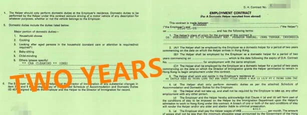 標準僱傭合約 (ID 407) 第2條說明一般僱傭合約期限為2年,以傭工在原居地申請來港工作為例,合約由傭工到達香港,即入境當日計算,為期2年;而在港申請轉換僱主的合約生效日期,則以入境事務處處長正式批准傭工逗留香港工作當日起計算2年。